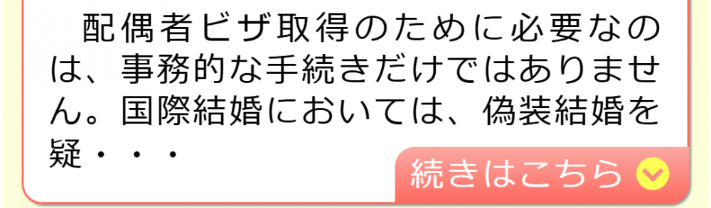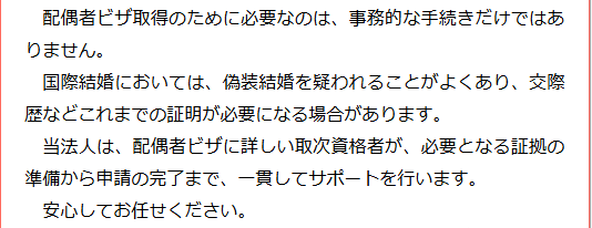 当法人の取次資格者は、様々な配偶者ビザの知識を積み重ねており、申請の注意点だけではなく、偽装結婚と疑われやすいケースやその対処法なども把握しています。
