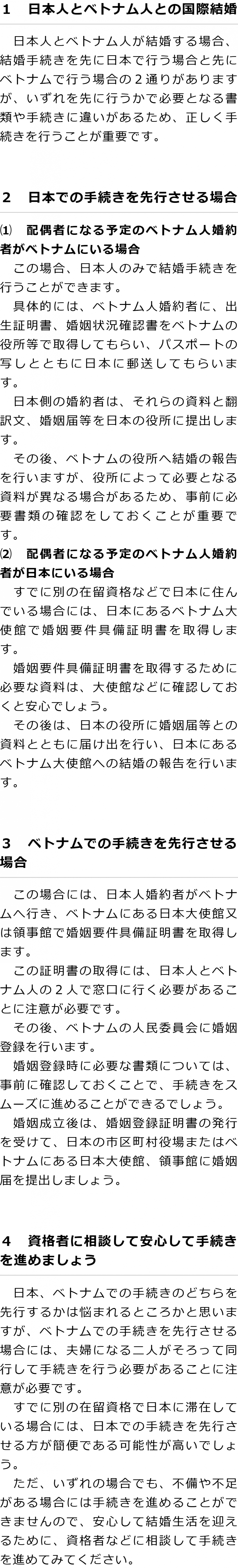 トップベトナム人との結婚手続き 階層構造▼ ベトナム人との結婚手続き 受付時間 平日 9時~21時、土日祝 9時~18時 夜間・土日祝の相談も対応します (要予約) 所在地 〒111-1111 ●町●●建物● 0120-41-2403 お問合せ・アクセス・地図