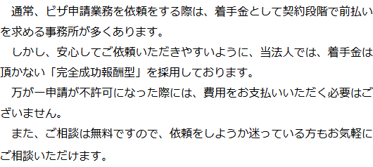 1 初期費用0円!成功報酬制! 2 夜間・土日祝も対応可能 ※要予約 3 ご希望・ご都合に合わせたご相談方法(対面・テレビ電話) 4 申請代行に留まらないアドバイス・書類収集 5 複雑な法令を理解した取次資格者がスピーディーに対応