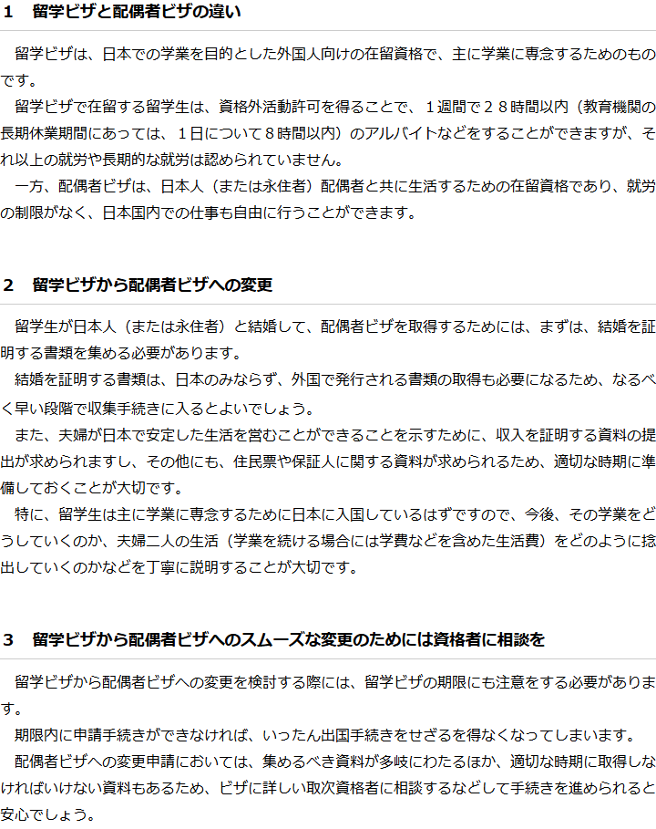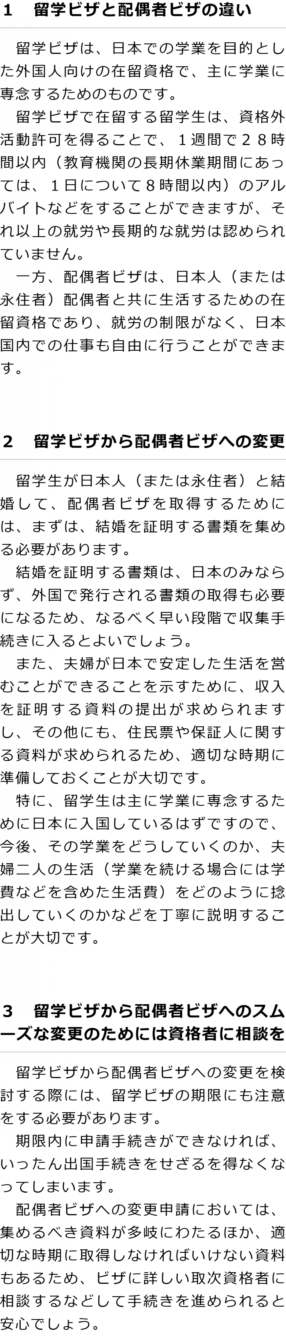 トップこんなお悩みはありませんか?留学ビザから配偶者ビザに変更したい 階層構造▼ こんなお悩みはありませんか?(目次) 留学ビザから配偶者ビザに変更したい こんなお悩みはありませんか?(目次)こんなお悩みはありませんか?トップ配偶者を海外から呼び寄せたい配偶者ビザへ切り替えたい配偶者ビザを更新したい短期滞在ビザから配偶者ビザに変更をしたい留学ビザから配偶者ビザに変更したい配偶者ビザを取得したいが、何をすればいいのか分からない離婚歴があり申請が通るか不安夫婦の年齢に差があり申請が通るか不安収入が少ないため申請が通るか不安ネットで知り合ったが、偽装結婚の疑いからビザが得られるか不安オーバーステイ・犯罪歴があるがどうすればいいか国籍別の結婚手続きについて知りたい 受付時間 平日 9時~21時、土日祝 9時~18時 夜間・土日祝の相談も対応します (要予約) 所在地 〒111-1111 ●町●●建物● 0120-41-2403 お問合せ・アクセス・地図
